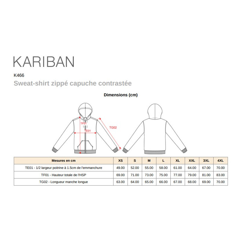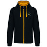 80% coton peigné / 20% polyester. Molleton gratté. Passe fil écouteurs dans la poche kangourou et encolure. Bord-côte bas de manches et de vêtement. Capuche doublée et contrastée avec cordon de serrage. Zip contrasté.
