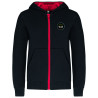 80% coton peigné / 20% polyester. Molleton gratté. Passe fil écouteurs dans la poche kangourou et encolure. Bord-côte bas de manches et de vêtement. Capuche doublée et contrastée avec cordon de serrage. Zip contrasté.