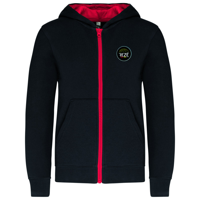 80% coton peigné / 20% polyester. Molleton gratté. Passe fil écouteurs dans la poche kangourou et encolure. Bord-côte bas de manches et de vêtement. Capuche doublée et contrastée avec cordon de serrage. Zip contrasté.